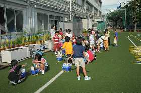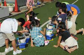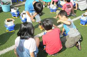 自分たちが育ててきたトマトのポットを片付けています。