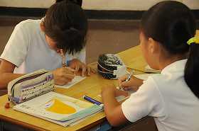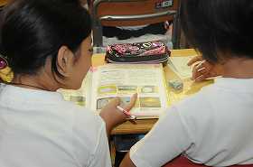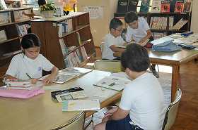 点字や手話について、教室や図書室で調べています。