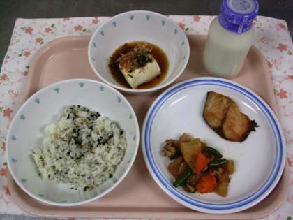 今日の給食は、わかめご飯・さばのゆず焼き・豚肉と大根の煮物・冷や奴・牛乳した。