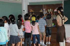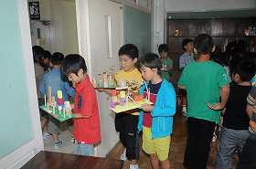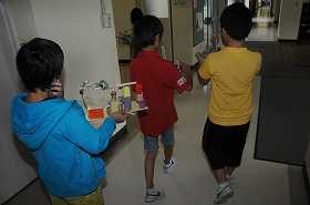 「トーテムポールの町」をテーマに、作品を完成させます。まず作品を図工室に運びます。