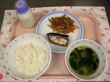 今日の給食は、ご飯・さんまの梅煮・じゃがいもの金平・冬瓜スープ・牛乳でした。