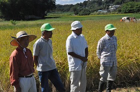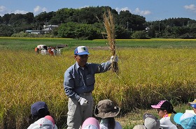 東松山の田んぼにいます。農業や今日の稲刈りのやり方などの話を聞いています。10:05