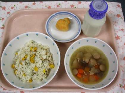 今日の給食は、ガーリックライス・フェジョアーダ・ポンデケージョ・牛乳でした。