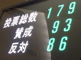 参議院特別体験プログラムです。参加した子どもたちが一人一人国会議員ですので、ボタンで賛成か反対かを示しています。その結果93対86で法案は成立しました。