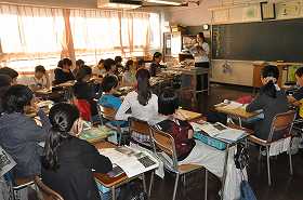 戦争中の人々の暮らしについて、資料を見ながら確認しています。