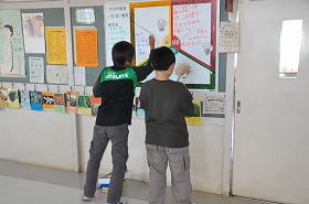 給食委員会の子どもたちが、明日の給食黒板を書いています。