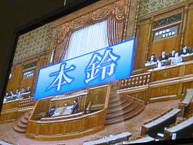 参議院特別体験プログラムです。委員会を通過した法案が本会議にかけられます。本鈴とともに本会議が始まりました。法案を提出した文部科学大臣が心配そうです。