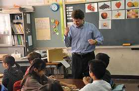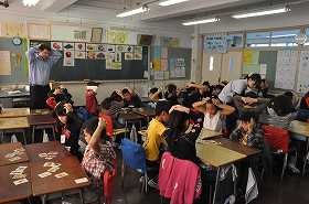 果物のカードを使い、英語でゲームをしています。
