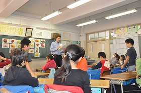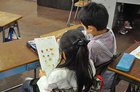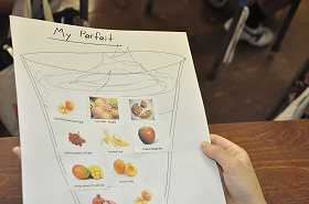 フルーツの絵を使って作った自分のフルーツパフェを確認しています。