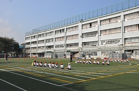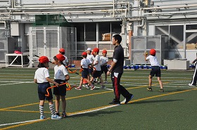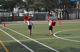 折り返しリレーをするための障害物の置き方をグループで工夫しいています。