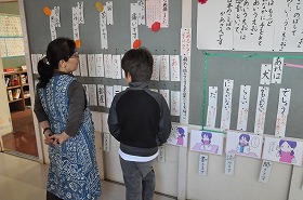 今日は廊下の掲示物を使ったり、あやとりをしたりしながら日本語指導をしています。