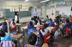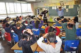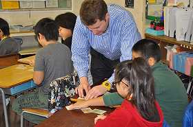 教科の書いてあるカードを使い、英語でゲームをしています。