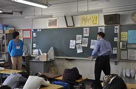 黒板に貼ってあるカードを覚え、目をつぶっているうちに抜き取ったカードをあてるゲームをしています。