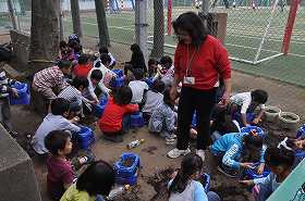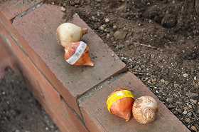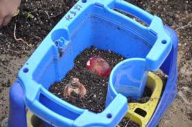 朝顔を植えていたポットに、チューリップと水仙の球根を植えています。