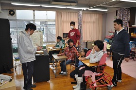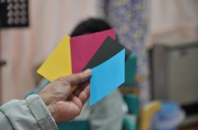 相撲ゲームをします。まずお相撲さんの紙の色を決めています。