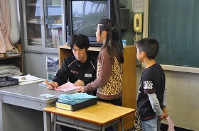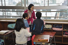 九九名人の弟子になった子どもたちを先生役にして、九九の練習をしています。