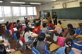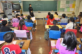 九九名人の弟子になった子どもたちを先生役にして、九九の練習をしています。
