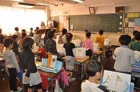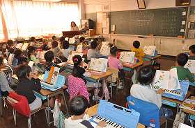 いろいろな曲を鍵盤ハーモニカで練習したり、歌ったりしています。今は、チューリップを歌った後で、鍵盤ハーモニカで演奏しています。