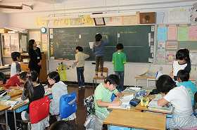 調べ学習が終わったグループから黒板に転記しています。