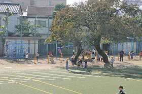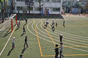 暖かい日差しを受けて、子どもたちが校庭で遊んでいます。