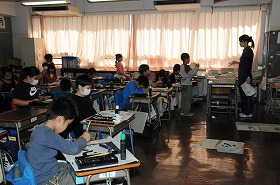 毛筆で「心」の練習をしています。でき上がった作品を選んでいます。