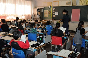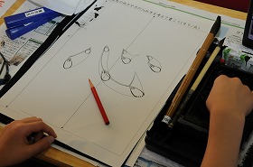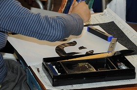 毛筆で「心」の練習をしています。