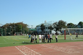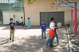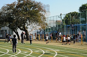 暖かい日差しの下で、たくさんの子どもたちが外遊びをしています。