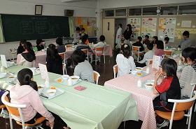 今日は4年1組の子どもたちが、ランチルームで給食を食べています。