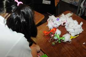 先日片付けた朝顔のツルを使ってリースを作っています。