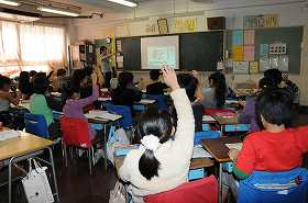 新しく覚える漢字の書き順をプロジェクターで確認し、空書きをした後、実際に書いています。