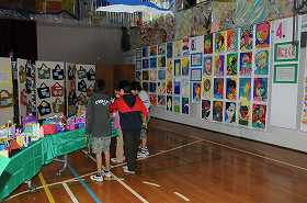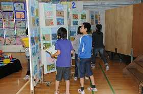 5年生の子どもたちが、展覧会の作品を鑑賞しています。