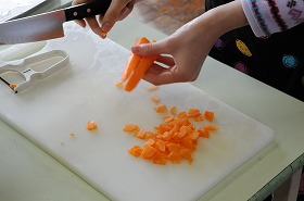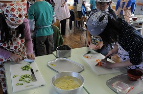 調理実習でポテトサラダを作っています。