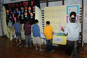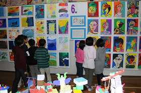 6年生の子どもたちが、展覧会の作品を鑑賞しています。