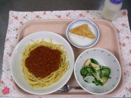 メニューは、スパゲティーミートソース・かぶとりんごのサラダ・ミルクくずもち・牛乳でした。