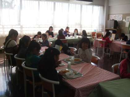 ランチルームでは、リクエストをした2年1組さんが、校長先生や専科の先生方を交えて給食を食べました。いつもとは違う教室や食器。ちょっと雰囲気が変わるだけでも一層楽しく食べることができます。