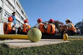 ベースボール型のゲームをします。まず、ゲームの進行や安全に関する確認をしています。
