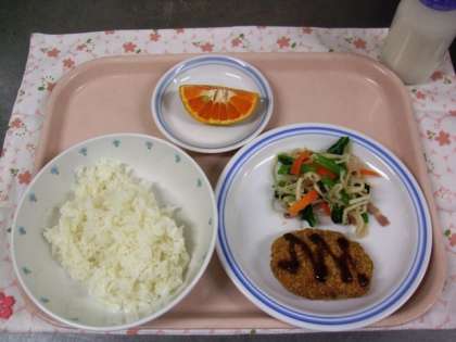 今日の給食は、ご飯・ムロアジメンチカツ・切干大根のベーコンソテー・果物(早香)・牛乳でした。