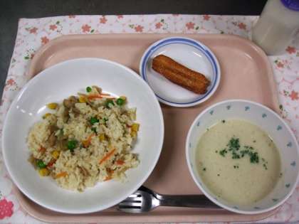 今日の給食は、鶏ごぼうピラフ・白いんげん豆のポタージュ・チュロス・牛乳でした。
