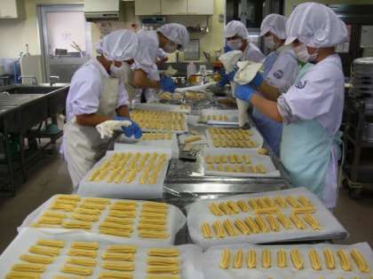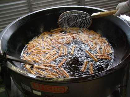 チュロスの生地はとても硬いため絞り出すのが一苦労でした。(全部で約450個ほど絞り終えた頃には、調理師さん達の手は震えていほど・・・)
