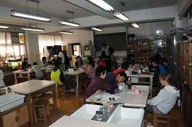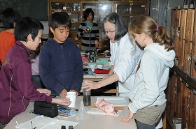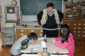 種類の違う土や砂などを入れ、水で混ぜ合わせたペットボトルの中身の沈み方を観察しています。