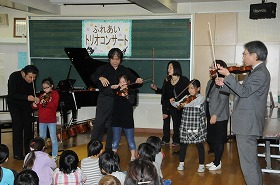 代表の子どもたちがバイオリン体験をしています。練習した後、二つの音階を使って、トリオの皆さんと、「ジャンバラヤ」の曲をいっしょに演奏しました。最後に、「ゆかいに歩けば」をトリオの皆さんの伴奏で歌いコンサートは終わりでした。