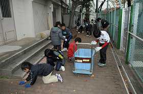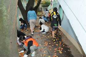 今日は、5年2組の子どもたちが落ち葉ひろいをしています。