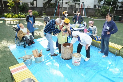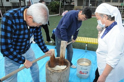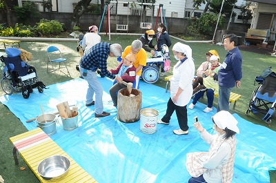 みんなでお餅をついています。