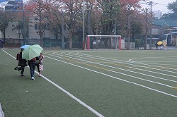 雨が降り、肌寒くなりました。子どもたちは傘をさして下校しています。
