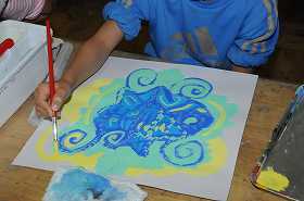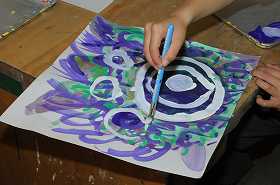 「わたしの花」をテーマに、太い筆の穂先や細い筆を使って色を重ね、作品を作っています。