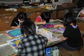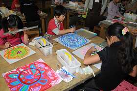 「わたしの花」をテーマに、太い筆の穂先や細い筆を使って色を重ね、作品を作っています。