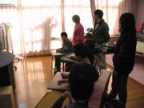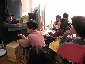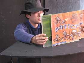 今日も紙芝男先生をお招きし、紙芝居「おむすびころりん」を演じていただきます。カーテンの向こうから登場です。