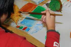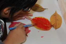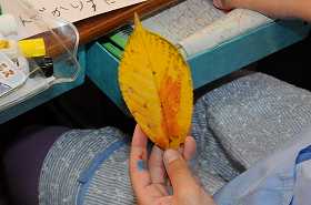 「スタンプでポン」をテーマに、落ち葉に色を塗って、紙にスタンプしています。
