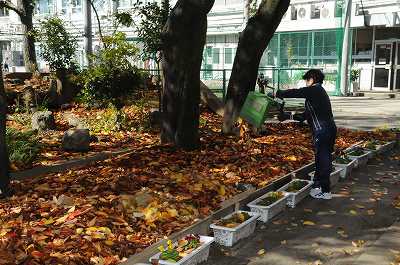落ち葉はきの後で、集めた落ち葉をビオトープに入れています。