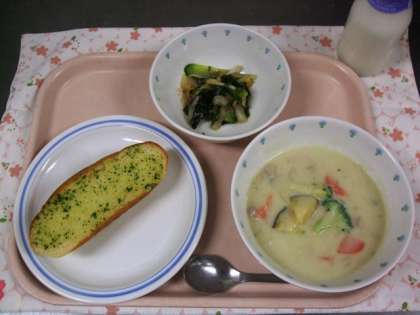 今日の給食は、ガーリックトースト・さつまいものシチュー・ミネラルサラダ・牛乳でした。